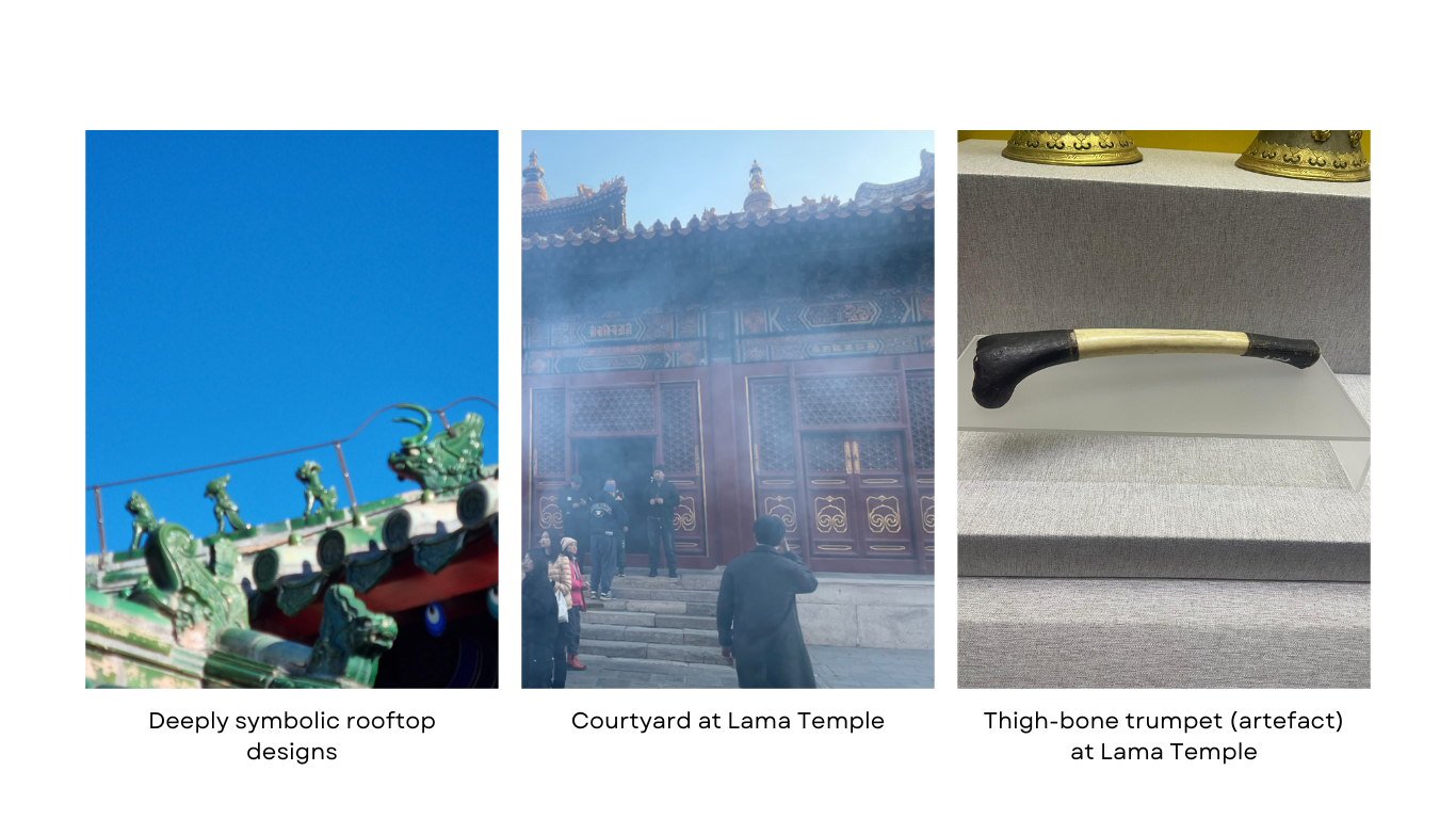 After a brief stop for Tanghulu and hot pot we made our way to the Lama Temple for a blessing of good fortune. The holy site of former Dalai Lamas is awe inspiring. We stood in courtyards hazy with incense gazing upon ancient works of art – the impossibly giant Buddhas, the vast columns made from single trees, the impossibly intricate embroidery of the Green Tara…We learned about human sacrifice, limbs repurposed as artefacts and objects of worship… talk about blowing your own trumpet… 😉